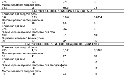 Эксплуатационные характеристики различных конфигураций циклонов, протестированных в данном примере, сопоставили, взяв за основу их эффективности улавливания и присутствие в чистом газе остаточного катализатора с размером, превышающим 10 мкм. Протестированными конфигурациями были: