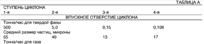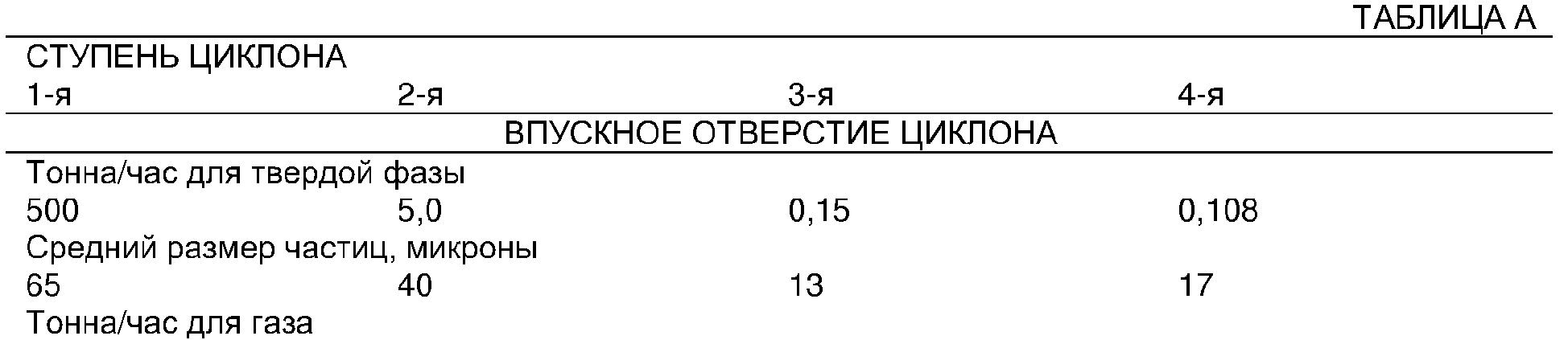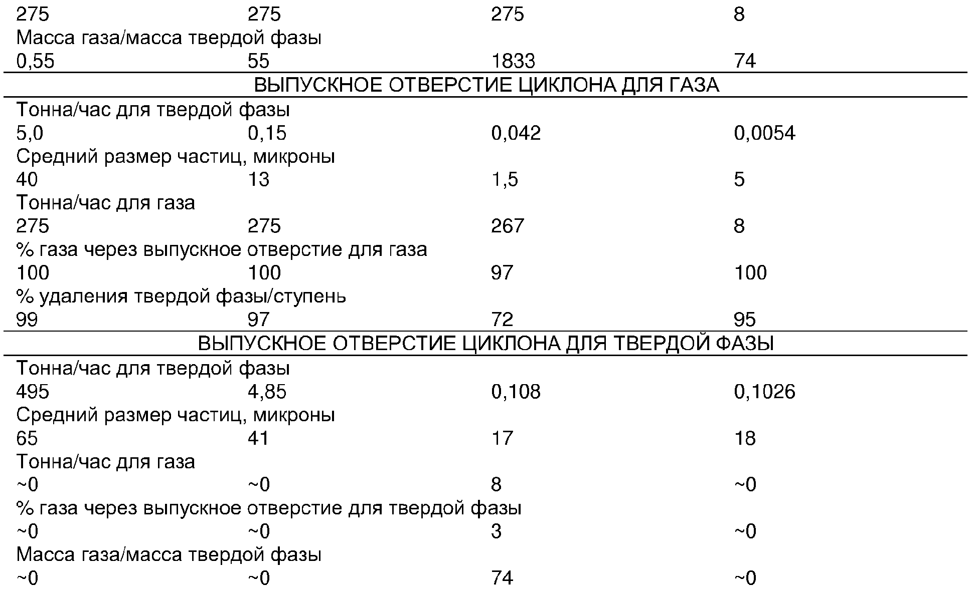 Загрузка по твердым частицам для различных циклонов в различных частях процесса FCC варьируется в широких пределах. Сепаратор третьей ступени осуществляет наиболее трудное разделение в том, что касается размера частиц, тогда как первичные сепараторы обычно обеспечивают извлечение 99% твердых частиц. Это можно иметь в виду при рассмотрении того, что происходит в примерной установке для FCC. В данной примерной установке разделение проходит в соответствии с тем, как показано ниже в таблице А, где процесс идет от первичных и вторичных циклонов, осуществляющих первоначальное отделение катализатора от газообразных продуктов сгорания в регенераторе, через TSS как стадию конечного разделения для газового потока. Отделенную пыль из TSS отбирают и подают на четвертую ступень. Газ с четвертых ступеней объединяют с газом с третьей ступени. Полный выброс составляет 0,0474 тонна/час, что соответствует загрузке 215 мг/нм3.
