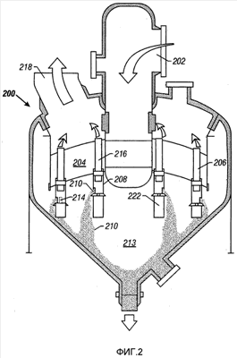 На фиг.2 показана TSS фиг.1, где для указания на соответственно подобные детали используют две последние цифры в ссылочных номерах на фиг.1 и 2. Циклоны 206 были модернизированы при помощи соответствующих экранирующих труб 222 в соответствии с принципами настоящего изобретения. Несмотря на то, что каждый цилиндр 208 циклонов 206 заканчивается на собственной высоте в пылеуловителе 212, отличающейся от соответствующих высот у соседних циклонов 206, которые расположены ближе или дальше от центра TSS 200, экраны 222 характеризуются обратным соответствием длин, так что нижние концы у всех экранов 222 заканчиваются приблизительно на одной и той же высоте, предпочтительно выше любой плотной фазы твердых частиц в пылеуловителе 212.