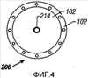 На фиг.3 изображен упрощенный вид в разрезе для предпочтительного циклона согласно изобретению, а на фиг.4 изображен вид снизу для того же самого циклона. Газ и захваченные твердые частицы от впускного отверстия аксиально входят в кольцевое пространство между цилиндром 208 и трубой выпускного отверстия для газа 216, где их тангенциально направляют завихривающие лопатки 224. Газовый поток закручивается в спираль вокруг трубы выпускного отверстия 216. Центробежная сила отбрасывает частицы к стенке цилиндра 208. Твердые частицы собираются в виде относительно тонкого, обтекающего слоя частиц, которые выпускают через один или несколько тангенциальных выпускных отверстий для пыли 210. Циклон 206 имеет закрытое днище 226, которое предпочтительно представляет собой фланцевую заглушку 228, прикрепленную болтами к стыковочному фланцу 230 на нижнем конце цилиндра 208. Повторный впуск газа обеспечивает расположенная по центру труба 214, проходящая через фланцевую заглушку 228 и/или прикрепленную к ней 228. Хотя это и не требуется, но удобно, когда экранирующая труба 222 имеет тот же самый диаметр, что и цилиндр 208, и ее приваривают или другим способом прикрепляют к фланцевой заглушке 228. При модернизации циклона от Chitnis et al. экран 222 добавляют к каждому циклону в результате, например, приваривания экранирующей трубы 222 к нижней поверхности фланцевой заглушки 228, являющейся опорой для трубы повторного впуска 214.