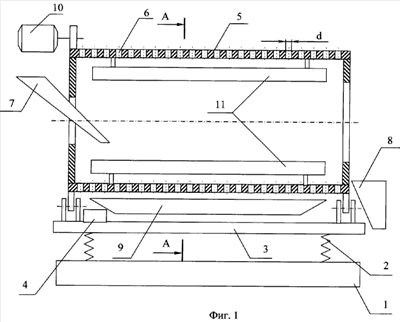 Барабанный грохот содержит основание 1 (фиг.1), расположенную на основании посредством амортизаторов 2 раму 3 с вибровозбудителем 4, установленный на раме с возможностью вращения барабан 5 с просеивающей поверхностью 6, где диаметр отверстий d составляет 1,05-1,1 от диаметра частиц мелкой фракции, загрузочное 7 и разгрузочное 8 приспособления, пробоотборник 9, реверсивный привод вращения 10, лопасти 11, выполненные в виде пластин и установленные внутри барабана 5. На фиг.2 показан вариант крепления лопастей 11 к барабану 5 с помощью шарниров 12. Для ограничения поворота лопастей установлены ограничители 13 и 14. На фиг.3 показан барабанный грохот, у которого лопасти 11 жестко соединены с валом барабана.