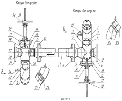 Конструкция камеры 2 приема шаров 4 аналогична камере 1 для запуска и выполнена в виде подстыковочной камеры 20, которая по фланцам 21 встроена в очищаемый трубопровод 3. Под указанной подстыковочной камерой 20 размещена и сообщена с ней камера-емкость 22 в виде коленообразного отвода, по торцу герметично перекрытого пробкой 23 с гайкой 24 (выполняют роль концевого затвора). Соосно с камерой-емкостью 22 над подстыковочной камерой 20 смонтирован патрубок 25, герметично перекрытый концевым затвором 26. Подстыковочная камера 20 снабжена ограничителем 27 движения шаров 4 (смещен в сторону неочищаемого трубопровода). В камере-емкости 22 и в патрубке 25 установлен тарельчатый клапан, состоящий из размещенного в камере-емкости 22 седла 28, выполненного в виде уплотнительного кольца, и из размещенного в патрубке 25 поршня 29 с ходовым штоком 30. Поршень 29 выполнен с наружным кольцевым уплотнением, соответствующим по форме седлу 28, и имеет перепускной клапан 31. Для обеспечения поступательного перемещения поршня 29 в патрубке 25 шток 30 связан через винтовую передачу 32, выполненную в виде винта-гайки, со штурвалом 33. Камера-емкость 22 снабжена краном 34 для сброса давления. При входе в камеру 2 приема может быть установлен механический датчик 35 с сигнализатором в виде флажка. Камера-емкость 7 в камере 1 для запуска вмещает один шар 4. Камера-емкость 22 камеры 2 приема вмещает также один шар 4, что обуславливается необходимостью регулярной очистки ее после прихода шара 4.