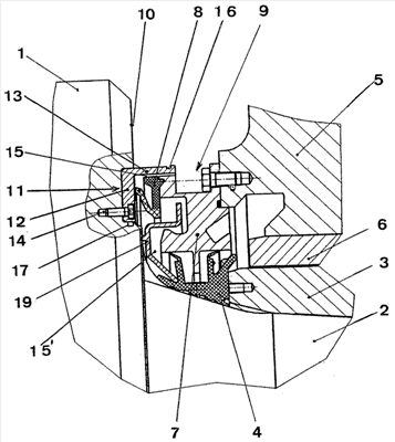 Между кольцевым уплотнением 8 и уплотнением 4 цапфы еще один кольцеобразный профиль 19 способствует тому, чтобы возникал как можно более извилистый лабиринт 15′.