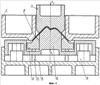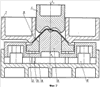 При ходе наружного ползуна пресса вниз при помощи закрепленного на нем прижима 7 осуществляют деформирование и прижим периферийных участков заготовки 8 по развертывающейся прижимной поверхности неподвижной части матрицы 2 (фиг.2).