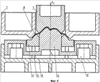 При дальнейшем ходе внутреннего ползуна пресса на завершающей стадии вытяжки (фиг.5) в крайнем нижнем положении подвижной части матрицы 5, когда она упирается в неподвижную нижнюю плиту штампа 4, пуансон 1 производит калибровку вытянутой детали 8, и зазор между поверхностями пуансона 1 и неподвижной периферийной 5 и подвижной центральной 2 частями матрицы становится равным толщине заготовки.