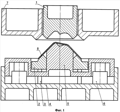 Сущность изобретения по варианту 1 характеризуется фиг.1-5. На фиг.1 показан разрез нового штампа для вытяжки детали на прессе двойного действия в момент загрузки предварительно изогнутой заготовки, на фиг.2 – в момент прижима периферийных участков заготовки прижимом штампа в крайнем нижнем положении наружного ползуна пресса и в момент перемещения внутреннего ползуна пресса, когда закрепленный на нем пуансон коснулся заготовки, на фиг.3 – в момент окончания начальной стадии вытяжки, когда центральная часть пуансона сдеформировала центральную часть заготовки по центральной части матрицы, которая под действием силы мощных пружин до этого момента оставалась неподвижной, на фиг.4 – в момент промежуточной стадии вытяжки, на фиг.5 – в момент завершения процесса вытяжки, где 1 – пуансон, 2 – неподвижная периферийная часть матрицы, 3 – опоры неподвижной периферийной части матрицы, 4 – нижняя плита штампа, 5 – подвижная центральная часть матрицы, 6 – пружины, 7 – прижим штампа, 8 – заготовка.
