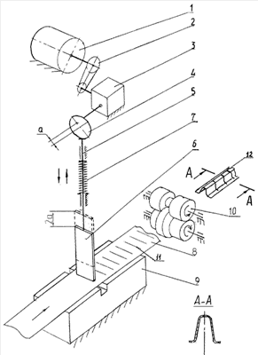 Металлическая лента 8 толщиной 0,2 мм и шириной 60 мм подается в штамп, состоящий из матрицы 9 и пуансона 6. Пуансон 6, осуществляя возвратно-поступательные движения, пробивает в ленте 8 с определенным шагом отверстия 11 перпендикулярно оси ленты. Далее лента 8 проходит через профилирующие ролики 10, приобретая необходимый профиль кривой второго порядка 12.