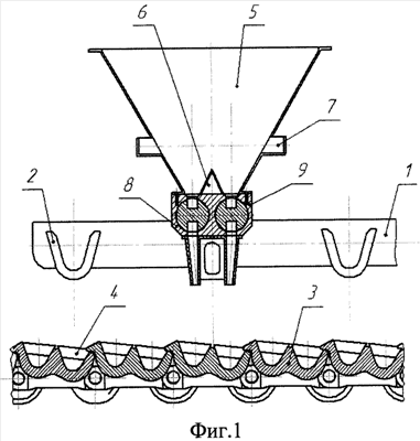 Известен также выбранный в качестве прототипа [3] способ получения шихтовой заготовки и разливочной машины для его осуществления, при котором разливочная машина, содержащая заливочное устройство, литейный конвейер с закрепленными на нем мульдами с ячейками, бункер для подачи твердых наполнителей, загрузочное устройство, размещенное под бункером, и привод загрузочного устройства, в которой загрузочное устройство выполнено в виде цепного конвейера с закрепленными на нем карманами, расположенными ниже уровня звеньев цепи конвейера над по крайней мере тремя в поперечном сечении ячейками мульд для непрерывной подачи дозы твердых наполнителей в соответствующие ячейки, а привод загрузочного устройства выполнен в виде находящегося в постоянном зацеплении с литейным конвейером мальтийского креста, на оси которого установлена ведущая шестерня, входящая в зацепление с паразитной шестерней, передающей движение на ведущие звездочки конвейера загрузочного устройства.
