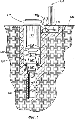 Как показано на Фиг.1, компоненты нижней части типичного устройства для вертикального литья алюминия, показанные внутри литейной ямы 101 и кессона 103, являются стаканом 102 гидравлического цилиндра, толкателем 106, установочным базовым корпусом 105, столом 107 и основанием 108 начального блока (называемым также начальной головкой, затравкой или нижним блоком), показанные все в вертикальной проекции под полом 104 литейного цеха.