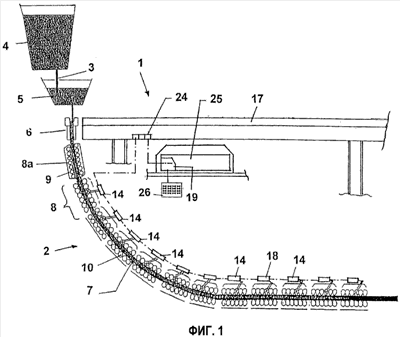 Особенность расположения измерительных элементов и блоков, согласно фиг.З, состоит в том, что на верхней раме 12 роликового сегмента сигналы датчиков положения гидравлических цилиндров 13а передаются в клеммную коробку 21. Образованный с помощью разъемного соединения 22 кабельный пакет 23 для передачи данных проходит от своего роликового сегмента 8 к неподвижному цеховому каркасу 17 или к машине 1 непрерывной разливки и к осевому регулятору 18. К этим осевым регуляторам 8 подключен клапанный стенд 26 на неподвижном каркасе 17. Сигналы осевого регулятора 18 передаются через модуль 20 полевой шины в имеющее программируемую память управляющее устройство 19 в пульте управления 25 оборудования 1 непрерывной разливки.