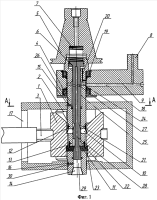 Автооператор 3 вводит зенковку 1 через окно в заготовке 17 и совмещает ось зенковки 1 с осью отверстий в заготовке. Оправка устанавливается в шпинделе станка и вводится в отверстия заготовки 17. Через разъем 8 и муфту 9 масло через отверстия 18, 19, 20 подводится в нижнюю полость гидроцилиндра. Шток 6 перемещается вверх, при этом его вырезы 21, 22 действуют на упоры 10 и шпонки 11, выталкивая их из пазов. Вырезы на штоке расположены так, что сперва выдвигаются упоры 10, обеспечивая базу для зенковки 1. При дальнейшем движении штока 6 вверх выдвигаются шпонки 11 из пазов, прижимая зенковку 1 к упорам 10. Шпонки 11 входят в пазы 23 на зенковке 1, обеспечивая передачу на нее крутящего момента. Одновременно через отверстия 18, 24 масло подводится во внутреннюю полость 25 втулки, далее через отверстия 26 – к карманам 15. Одновременно через отверстия 27, 28, полость 29 и отверстия 30 масло подводится к нижнему ряду карманов 16. Благодаря расположению и форме карманов при вращении оправки в зазоре создается гидродинамический эффект, центрирующий оправку по оси отверстий.