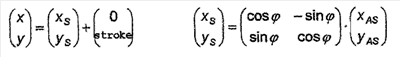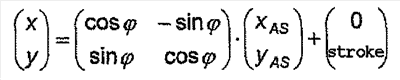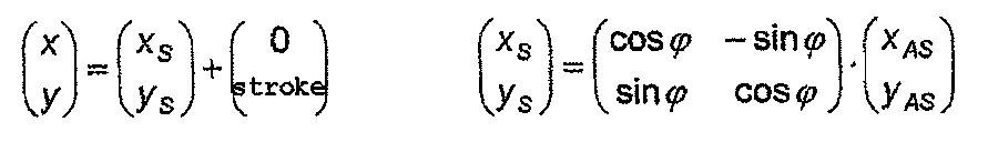 Процесс движения суппорта 14 и соответствующих уравновешивающих тел 20 показан на фиг.3 сплошными и пунктирными линиями. Центры 28′, 28 тяжести уравновешивающих тел 20 перемещаются в процессе перемещения по траектории суппорта 14 в противоположном направлении. Если совместить ось 16 перемещения суппорта 14 с осью y основной части, а оси 15 вращения обоих уравновешивающих тел 20 переместить в начало системы координат суппорта 14, то для определения геометрического места произвольной точки xAS, yAS уравновешивающего тела в системе координат х, у основной части справедливы следующие соотношения:
