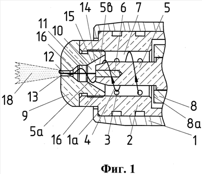 Из разрядной камеры (11) через конфузорное сопряжение (16) в виде усеченного конуса поток газа поступает в выходное отверстие (13) центрального канала (10) сопловой насадки (9), образующая поверхности которого параллельна оси разрядной камеры.
