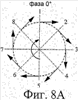 На фиг.8А и 8В изображены условия противоположного направления рабочего вращения при разности фаз 0° и разности фаз 360°. При наложении векторов движения в моменты времени, которые обозначены теми же арабскими цифрами, происходят относительные перемещения, как можно видеть из фиг.8С, для разности фаз 0° и 360°, причем становится очевидным, что создается линейное относительное перемещение, за исключением моментов времени 3 и 7, в которых относительное перемещение равно нулю.