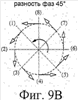 На фиг.9А-9С изображены условия при противоположном направлении рабочего вращения и начальной разности фаз в 45° в 315° с постоянно изменяемой разностью фаз. С помощью наложения векторов движения в соответствии с фиг.9А и 9В начальная разность фаз в 45° приводит к линейному относительному перемещению амплитуды для моментов времени 2, 3, 6 и 7, которая меньше, чем амплитуда для моментов времени 1, 4, 5 и 8. В связи с этим амплитуда при разности фаз в 45° при 67,5° и 247,5° проходит значение, равное нулю, а при 157,5°, как и при 337,5°, проходит через максимальное значение амплитуды.