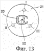 Фиг.13 упрощенно представляет расположение трех головок/прижимных осей для сварки трением в орбитальной плоскости по отношению к центру тяжести поверхности в плоскости соединения для конструктивного стержня; и