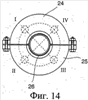Фиг.14 упрощенно представляет расположение головок для сварки трением на диске, который окружает часть свариваемой трубы и скреплен с ней установочными болтами.