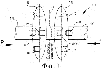 На фиг.1 упрощенно представлено устройство 10 для орбитальной сварки трением, предназначенное для сварки двух удлиненных частей 12 и 14 трубы, прижатых друг к другу своими концами в плоскости F соединения с осевой силой Р. На обеих частях 12 и 14 трубы неподвижно закреплены фрикционные диски 16 и 18. Преимущество такого расположения заключается в том, что действующая объединенная ось давления и действующая объединенная ось трения расположены на одной линии и положение центра тяжести поверхности соединения совпадает с положением центра масс. Очевидно, что на практике могут встретиться случаи, когда два центра тяжести удалены друг от друга, то есть ось приложения силы не безусловно должна совпадать с осью трения.