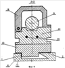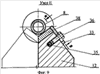 В вертикальной части стойки выполнен паз, который имеет две плоскости 15 и 16 для крепления призм 11 и 12. По поверхности 16 путем перемещения плиты маховиком 31 производится проверка перпендикулярности плоскости стойки относительно направляющих станины (станка) устройства. По поверхности паза 15 определяется точность соосного расположения вертикальной части стойки относительно направляющих станины устройства. Вертикальная часть стойки 14 соединена с основанием 13 болтами 17. В вертикальной части стойки закреплена проушина 18, которая обладает возможностью поворота для установки детали 8 на призмы 11 и 12, на штифте соединяющих детали 14 и 18. В проушине 18 установлен подпружиненный упор 19, удерживающий деталь в оси вращения в процессе обработки. Проушина 18 прижата к вертикальной части стойки болтом 20.