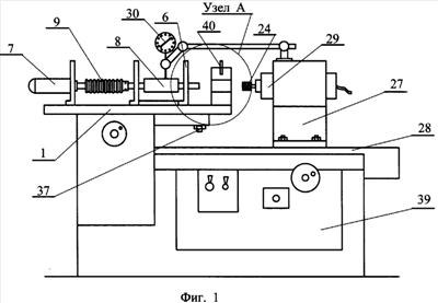 Ограничение перемещения детали вдоль оси в процессе шлифования устраняет упор 33, который имеет твердосплавный наконечник 34. Упор может быть установлен на призме в зависимости от конструкции обрабатываемой детали. Крепление упора на боковой и торцевой поверхности осуществляется с помощью резьбы 35, нарезанной в призме, и болтом 36, которым производится закрепление упора к призме. По оси 37 плита установлена с возможностью поворота для шлифования конусных отверстий. Наибольший угол разворота плиты равен 30 градусов. Устройство снабжено станиной 39 с направляющими и приспособлением 40 для правки шлифовального круга.