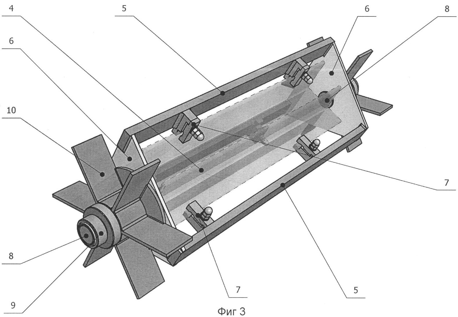 Контейнер снабжен технологическим приспособлением 3 для размещения и закрепления обрабатываемой детали 4, выполненным в виде жесткой рамной конструкции, состоящей из продольных планок 5 и торцевых стенок 6. На планках установлены крепежные элементы 7 в форме зажимов для закрепления обрабатываемой детали 4. К торцевым стенкам 6 с обеих сторон приспособления 3 приварены валы 8 с установленными на них неподвижно металлическими крыльчатками 10 с радиально закрепленными прямоугольными лопастями. Лопасти крыльчатки 10 имеют ширину 60-80 мм, а рабочая длина лопастей составляет 2/3 величины радиуса контейнера 1, в котором смонтировано технологическое приспособление 3. Кроме того, валы 8 на своих концах снабжены цапфами для закрепления в подшипниковых узлах 9, 2, состоящих из нижней неподвижной части, закрепленной на стенке контейнера болтами, и верхней съемной. Конструкция технологического приспособления 3 рассчитана на габаритные размеры и, прежде всего, длину конкретной детали 4. При необходимости закрепления для обработки детали большей длины применяется приспособление соответствующей длины.