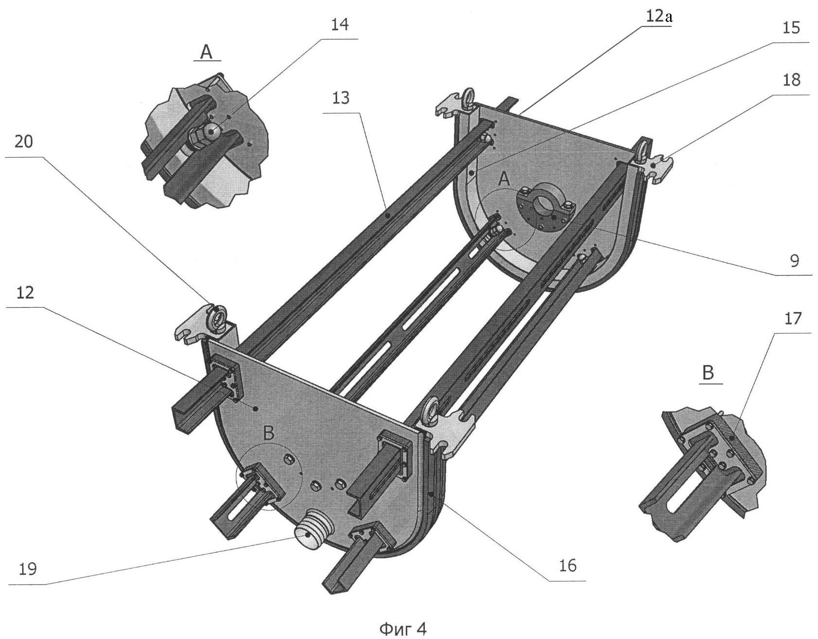 Кроме того, контейнер 1 снабжен устройством ограничения рабочей зоны 11 контейнера, выполненным в виде связанных между собой передвижных стенок 12 и 12а, вставляемых в контейнер и имеющих форму его поперечного сечения. Передвижные стенки 12а, 12 состоят из собственно стенок, снабженных по контуру ободами 15. На внутренних поверхностях передвижных стенок устройства ограничения рабочей зоны контейнера, обращенных друг к другу, установлены подшипниковые узлы для закрепления обрабатываемых деталей. Закрепление деталей или приспособлений с деталями может быть выполнено с помощью подшипниковых узлов 9, аналогичных по конструкции и назначению подшипниковым узлам 2. Устройство ограничения рабочей зоны контейнера выполнено регулируемым по длине за счет того, что передвижные стенки связаны между собой стержнями в виде швеллеров 13, перемещающихся в вырезах стенок и фиксируемых относительно них.