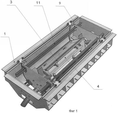 Контейнер 1 (см. Фиг.1 и 2), в котором происходит обработка, представляет собой жесткую прочную конструкцию из листовой стали, которой придана определенная форма в сечении (U-образная, прямоугольная, прямоугольная с закругленными краями) и приваренными торцевыми стенками 21, 22.