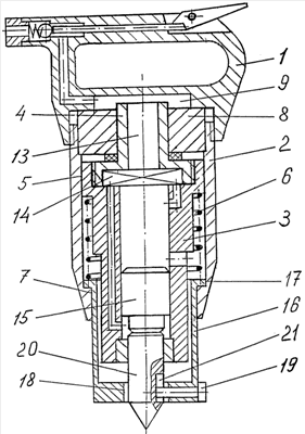 При установке рабочего инструмента 20 в корпус 3 фиксатор 19 устанавливается на муфту 16 и западает в паз 21 в рабочем инструменте 20, тем самым фиксирует его в определенном положении, не позволяет вращаться относительно муфты 16, обеспечивает возможность продольного перемещения инструмента 20 относительно фиксатора 19 с муфтой 16.