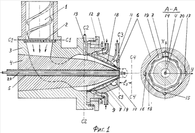 На Фиг.1 в сечении по А-А показаны четыре овальных профильных зоны 14, 15 и 16, 17, служащие для равномерного распределения масла вокруг гибкой волнообразной оболочки 7 в зоне противодавления 18 циркуляции масла. Эту зону 18 целесообразно называть зоной противодавления, так как давление масла, циркулирующего через эту зону, противостоит давлению материала, протекающего вдоль поверхности дорна. Масло в зону 18 подается по четырем подводящим трубкам в центральные области четырех овальных профильных зон 14, 15, 16, 17. Посредством четырех подводящих трубок (8, 9) и выводящей трубки 11 осуществляется циркуляция высокотемпературного масла под давлением через внутреннюю замкнутую полость 18 под оболочкой 7. Сечение гибкой оболочки 7 представляет собой волнообразную кольцевую, гибкую структуру, как это хорошо видно на фрагменте «сечение по А-А» на Фиг.1. Волнообразная гибкая оболочка 7 под действием снижающегося внутреннего давления масла расширяется по всем радиальным направлениям, занимая при этом новое положение, обозначенное на Фиг.1 пунктирной линией 19. При этом, как это видно из Фиг.1, проходное сечение для движущейся вдоль дорна пластмассы увеличивается и, следовательно, уменьшается гидравлическое сопротивление конусного участка головки экструдера. При увеличении давления масла в зоне противодавления 18 наоборот гибкая оболочка 7 сжимается, проходное сечение для движущейся пластмассы в конусной части дорна уменьшается и, следовательно, увеличивается гидравлическое сопротивление конусного участка головки экструдера. Таким образом, за счет изменения давления масла в зоне 18 матрицы можно оперативно с большим быстродействием менять гидравлическое сопротивление головки экструдера.