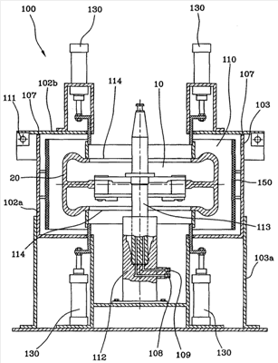 Еще более предпочтительно, если опорный контакт, создаваемый поверхностями 114, поддерживается в состоянии под давлением предпочтительно с помощью гидравлических устройств. Например, в варианте осуществления, показанном на чертеже, две пары гидравлических поршней 130, одна из которых соединена с верхней половиной 102b, а другая – с опорной плитой 103a, способны обеспечить приложение давления к тороидальной опоре 10, подобной проиллюстрированной выше, посредством опорных поверхностей 114, когда верхняя половина 102b закрыта над нижней половиной 102a.