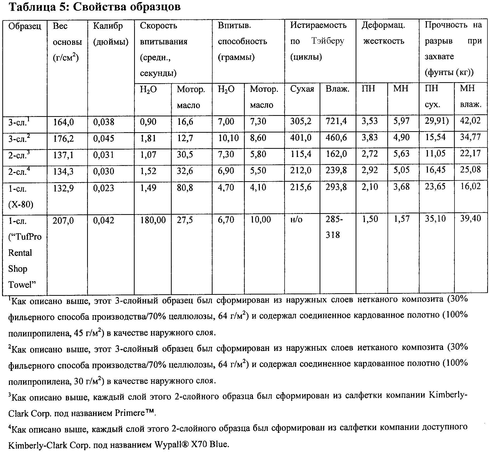 Как указано, 3-слойные образцы обеспечивали прекрасные впитывающие свойства, измеренные как по скорости впитывания, так и по впитывающей способности как для воды, так и для масла. Эти 3-слойные образцы также обеспечивали улучшенную прочность и осязательные свойства.