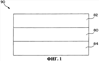 Ссылаясь на Фиг.1, например, показан один вариант выполнения многослойного материала 90, образованного в соответствии с изобретением. Как показано, по меньшей мере один внутренний слой 80 расположен между двумя наружными слоями 82 и 84. Должно быть понятно, что может быть использовано любое количество внутренних слоев, поскольку материал включает по меньшей мере один внутренний слой и по меньшей мере два наружных слоя. Например, в одном варианте выполнения изобретения, многослойный материал 90 может содержать два дополнительных внутренних слоя (не показаны), между которыми расположен внутренний слой 80. Эти дополнительные внутренние слои, аналогично, расположены между двумя наружными слоями 82 и 84. Свойствами одного или нескольких этих слоев можно селективно управлять в соответствии с изобретением.