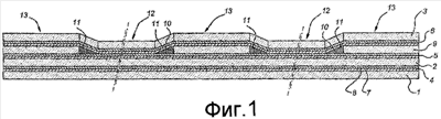 Тот факт, что это изобретение не ограничивается упоминаемыми выше вариантами, должно быть понятно из следующих неисчерпывающих возможностей, представленных на Фиг.5-12. Согласно этим фигурам: слои, соответствующие слоям в вариантах осуществления в соответствии с Фиг.1 и 2, указаны теми же ссылочными позициями. Фиг.5 показывает не только прерывистый металлический слой 9, но и дополнительный прерывистый металлический слой 9′. Отверстия последнего слоя ступенчато выравнены относительно друг друга в месте углубленной части 12. Кроме дополнительного металлического слоя 9′ и прерывистого армированного волокном связывающего слоя 15 этот вариант аналогичен варианту согласно Фиг.2.