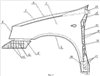 1. Крыло переднее для легкового автомобиля, выполненное из пластических масс и содержащее верхний вертикальный фланец, выполненный в виде объемного элемента с ребрами жесткости на тыльной поверхности крыла, нижний вертикальный фланец для связи с боковиной кузова, дугообразный вырез и усилительный элемент, разъемно соединенный с крылом и расположенный вдоль задней кромки тыльной поверхности крыла, отличающееся тем, что верхний вертикальный фланец расположен в нижней части верхнего пояса крыла и имеет вертикальные ребра на лицевой поверхности фланца, а ребра жесткости тыльной поверхности выполнены вертикально по высоте фланца и соединены между собой горизонтальным ребром.