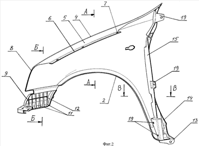На верхней образующей (4) крыла сформирован уступ (5), выполненный вдоль верхнего пояса крыла (1) и на котором выполнен верхний горизонтальный фланец (6) с отверстиями (7) для крепления крыла (1) к кузову (фиг.5). Уступ (5) с фланцем (6) в установленном на автомобиле положении расположен под капотом. На нижней части верхнего пояса крыла (зона, которая стыкуется с фарой и передним бампером) со стороны боковой передней кромки (8) выполнен верхний вертикальный фланец (9) в виде объемного элемента, который выступает за боковую переднюю кромку (8) и имеет на лицевой поверхности прямоугольные ребра (10), упирающие в поверхность крыла (1) и предназначенные для обеспечения постоянного зазора между крылом (1) и бампером (не показан) (фиг.1, 6). На тыльной поверхности фланца (9) по его высоте выполнены вертикально вытянутые ребра (11) жесткости, соединенные между собой горизонтальным ребром (12), что обеспечивает жесткость крепления крыла к кузову (фиг.2).