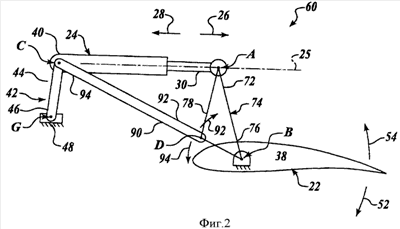 Как показано на фиг.2, исполнительный узел 60 включает удлиняемый в продольном направлении исполнительный механизм 24, который выполнен с возможностью удлинения в первом направлении 26 и отвода назад во втором направлении 28. Исполнительный механизм 24 имеет первый конец 30, соединенный с возможностью поворота в первой точке А с первой частью 72 приводного элемента 74. Как дополнительно показано на фиг.2, приводной элемент 74 включает вторую часть 76, которая соединена без возможности прокручивания (например, жестко) с приводньм валом 38 (показан на виде с торца на фиг.2) во второй точке В. Приводной вал 38 соединен в свою очередь с поверхностью 22 управления. Кроме того, второй конец исполнительного механизма 24 соединен с возможностью поворота в третьей точке С с первым концом 44 навесного звена 42, а второй конец 46 навесного звена 42 соединен с возможностью поворота в точке G основания с относительно неподвижной опорой 48. Исполнительный узел 60 дополнительно содержит реактивное звено 90, имеющее первый конец, соединенный с возможностью поворота с третьей частью 78 приводного элемента 74 в четвертой точке D. Второй конец 94 реактивного звена 90 соединен с возможностью поворота с третьей точкой С.