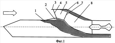 С целью уменьшения распространения шума из компрессора двигателя дозвуковой диффузор 8 выполнен криволинейным, фиг.2, таким образом, что его выходное сечение 15 или вход в двигатель выполнен ниже пространственного клина 2 на величину диаметра входа в двигатель, т.е. чтобы двигатель располагался в корпусе летательного аппарата. Контур криволинейного дозвукового диффузора 8 рассчитывается из условия безотрывного течения в диффузоре минимальной длины.