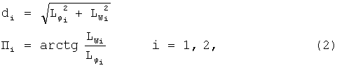 где  LВПП =( ВПП1– ВПП2)·Rз, Rз – радиус Земли, определяют географические координаты местоположения ЛА – широту ЛА и долготу ЛА, северную VN и восточную VE составляющие скорости ЛА, по полученным значениям географических координат ЛА ЛА, ЛА и запомненным значениям географических координат двух заданных точек ВПП ВПП1, ВПП1, ВПП2, ВПП2 вычисляют горизонтальные дальности di от ЛА до этих точек и пеленги Пi на эти точки по формулам