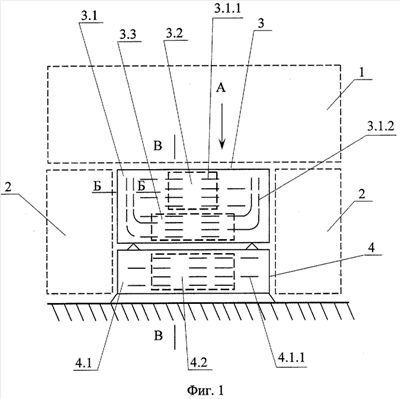 По предлагаемому способу (см. фиг.1, 2, 3, 4, где 1 – зона размещения антенны; 2 – зона размещения панелей солнечных батарей (показано в сложенном положении на участке выведения на орбиту); 3 – МПН; 4 – МСС; 3.1 – радиатор МПН; 4.1 – радиатор МСС; 3.1.1, 4.1.1 – прямые тепловые трубы; 3.1.2 – Г-образные тепловые трубы; 3.2, 4.2 – зона размещения нетеплонапряженных приборов; 3.3 – зона размещения теплонапряженных приборов; 3.4 (4.4) – приборы; 3.1.3 (4.1.3) – наружная (внешняя) обшивка панели радиаторов; 3.1.4 (4.1.4) – внутренняя обшивка панели радиаторов; 3.1.1.1 (4.1.1.1) (3.1.2.1) – зоны испарения; 3.1.1.2 (4.1.1.2) (3.1.2.2) – зоны конденсации; 3.1.5 – оптический солнечный отражатель; 3.5 (4.5) -теплоизоляция) компоновку КА, например телекоммуникационного спутника с потребляемой энергетической мощностью 2 кВт с длительным сроком эксплуатации на орбите (15 и более лет), выполняют следующим образом: КА выполняют состоящим из двух модулей: модуля полезной нагрузки 3 и модуля служебных систем 4, и приборы 3.4 (4.4) устанавливают на внутренних обшивках 3.1.4 (4.1.4) их радиаторов 3.1 (4.1) – сотовых панелей с встроенными в них напротив области размещения приборов испарительными зонами 3.1.1.1 (4.1.1.1) (3.1.2.1) горизонтально расположенных прямых 3.1.1 (4.1.1) и Г-образных 3.1.2 нерегулируемых тепловых труб, присоединенными в этой области полками 3.1.1.3 (4.1.1.3) (3.1.2.3) к внутренней обшивке 3.1.4 (4.1.4) панелей, с размещением зон конденсации 3.1.1.2 (4.1.1.2) (3.1.2.2) труб в областях панелей, свободных от приборов, при этом радиаторы размещают в плоскостях, перпендикулярных к осям +Z (северная сторона КА) и -Z (южная сторона КА) аппарата.