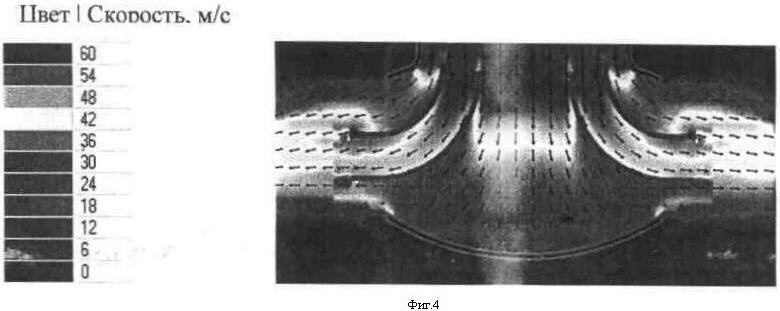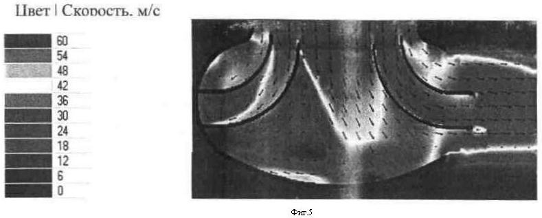 На фиг.4 и 5 иллюстрируется векторное поле скоростей в каналах диффузоров соответственно для вариантов 1 и 2.