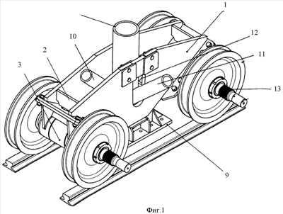 Подшипниковые узлы колесных пар и корпус соединены между собой болтовыми соединениями по плоскостям, расположенным под углом к опорным поверхностям рельсов.