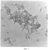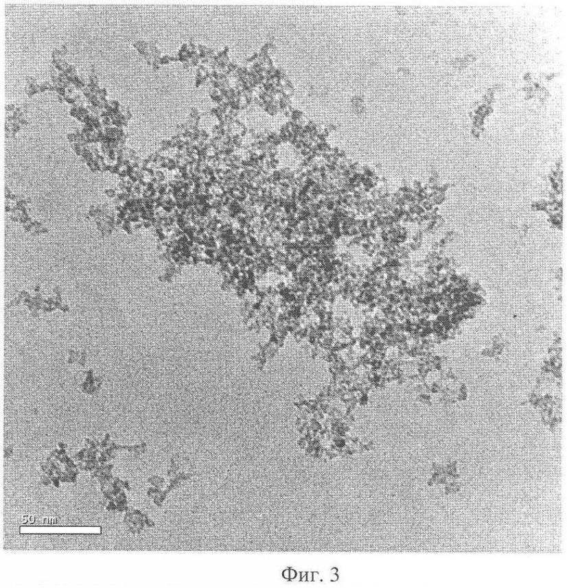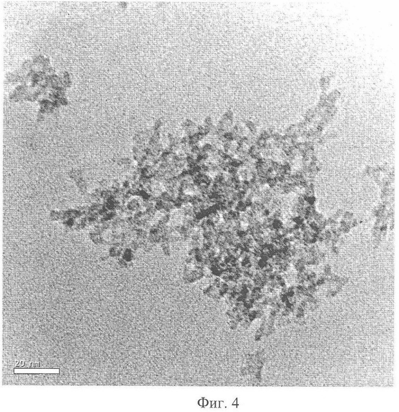 Исходя из пересчета по измеренной удельной поверхности Sy средний размер частиц составляет от 10 до 60 нм (Табл.3), что существенно больше, чем различимый на фотографиях с электронного микроскопа реальный диаметр частиц dВЕТ=3-5 нм (Фиг.3). По-видимому, это связано с существенной агломерацией частиц, которая возникает из-за недостаточной закалки частиц в полете перед попаданием на мишень (Фиг.4). Доказательством этого служат результаты эксперимента, выполненного при откачке камеры испарения до давления 0,3 Па (Табл.3, 7), которые показывают существенное уменьшение удельной поверхности Sy. Кроме того, из данных табл. 3 видно, что увеличение давления в камере испарения более 20 Па ведет к существенному уменьшению выхода порошка вследствие потерь пучка электронов на газе.