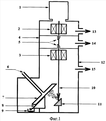 Устройство работает следующим образом. Импульсная электронная пушка 1 откачивается вакуумным насосом 13 до высокого вакуума, камера дрейфа 4 откачивается вакуумным насосом 14 до среднего вакуума, а камера испарения 12 откачивается вакуумным насосом 15 до газа низкого давления. Перепад давления между пушкой 1 и камерами 4, а также между камерами 4 и 12 создается двумя газодинамическими соплами 5. Пушка 1 формирует электронный пучок 10, который фокусируется для прохода через сопло 5 в камеру дрейфа 4 фокусирующей катушкой 2. После входа через второе сопло 5 в камеру испарения 12 пучок фокусируется на мишени 11 и сканируется по ней отклоняющей катушкой 3. Испаренный пучком 10 материал мишени 11 в виде паров тормозится на газе низкого давления и попадает на диск 7, который охлаждается изнутри жидким азотом 6. Полученный порошок соскребается скребком 8 и попадает в бункер 9.