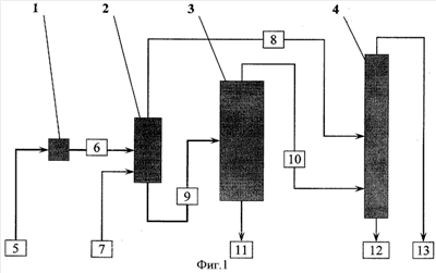 На фиг.1 представлена принципиальная блок-схема материальных потоков установки двухстадийного выделения из оксидата 40-60% пероксида водорода. На фиг.2 показаны область детонации смесей и составы жидкости на ступенях колонны вакуумной ректификации (пример 3).