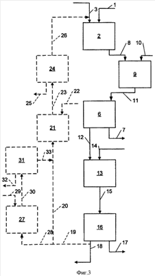 В этот бак 27 через трубопровод 29 снова вводят нейтрализующий агент, предпочтительно гидратированную известь или карбонат кальция, чтобы получить рН порядка 9-10, в результате чего осаждаются все остаточные примеси, такие как амфотерные металлы и т.д. Полученную суспензию по трубопроводу 30 направляют в сепаратор 31. Отделенный осадок удаляют через 32, а сверхчистый фильтрат, образованный CaCl2 в растворе, через трубопроводы 33 и 20 направляют в реактор 21 обработки серной кислотой.