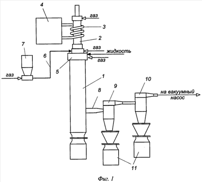 Способ реализовали на высокочастотной плазменной установке, показанной на фиг.1. Здесь 1 – плазмохимический реактор с расположенным на его оси высокочастотным индукционным (ВЧИ) плазмотроном 2, который соединен через индуктор 3 с источником электропитания – высокочастотным генератором 4. Плазмохимический реактор содержал блок 5 распыления жидкости, состоящий из четырех высоконапорных форсунок внутреннего смешения для распыления раствора, установленных пол углом 15-30° к направлению движения потока низкотемпературной плазмы. Порошок элементного алюминия транспортировался по трубопроводу 6 газом из бункера-дозатора 7 в реактор 1 на участке между соплом плазмотрона 2 и блоком 5 распыления жидкости. Отводным коллектором 8 реактор 1 соединялся с сепаратором порошка – системой из последовательно установленных металлотканевого 9 и металловойлочного 10 фильтров с бункерами-приемниками 11 порошка оксида алюминия. Парогазовая смесь из сепаратора порошка отводилась в систему газоочистки и на вакуумный пост.