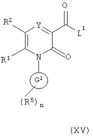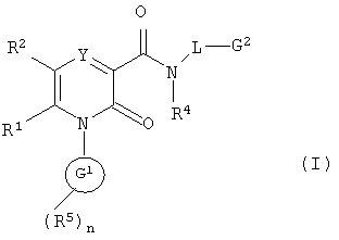 где Y представляет собой СН; R1 представляет собой H или С1-6алкил; R2 представляет собой фенил или пяти- или шестичленное гетероароматическое кольцо, содержащее от 1 до 4 гетероатомов, независимо выбранных из О, S и N; где указанное ароматическое кольцо возможно замещено 1-3 заместителями, выбранными независимо из ОН, С1-6алкила, C1-6алкокси, NR58COR50, COOR51, CONR53R54 и NR47R48; где указанный алкил возможно дополнительно замещен ОН, C1-6алкокси, CN или CO2R49; R47 и R48 независимо представляют собой Н, С1-6алкил или С2-6алканоил; G1 представляет собой фенил; R5 представляет собой Н, галоген, C1-6алкил, CN или C1-3алкил, замещенный одним или более чем одним атомом F; n представляет собой целое число 1, 2 или 3 и, когда n представляет собой 2 или 3, каждая группа R5 выбрана независимо; R4 представляет собой Н; L представляет собой связь, О, NR29 или C1-6алкил; либо R4 и L соединены вместе так, что группа -NR4L- представляет собой 5-7-членное азациклическое кольцо, возможно включающее один дополнительный гетероатом, выбранный из О, S и NR16; G2 представляет собой моноциклическую кольцевую систему, выбранную из: 1) фенила, 2) 5- или 6-членного гетероароматического кольца, содержащего от одного до трех гетероатомов, независимо выбранных из О, S и N, 3) С3-6 насыщенного или частично ненасыщенного циклоалкила или 4) С4-7 насыщенного или частично ненасыщенного гетероциклического кольца, содержащего один или два гетероатома, независимо выбраных из О, S и NR17, и, возможно, дополнительно включающего карбонильную группу; или G2 представляет собой бициклическую кольцевую систему, в которой эти два кольца либо конденсированы вместе, либо связаны вместе прямой связью, либо разделены атомом О, и каждое из двух колец независимо выбрано из: 1) фенила, 2) 5- или 6-членного гетероароматического кольца, содержащего от одного до трех гетероатомов, независимо выбранных из О, S и N, 3) С3-6 насыщенного или частично ненасыщенного циклоалкила или 4) С4-7 насыщенного или частично ненасыщенного гетероциклического кольца, содержащего один или два гетероатома, независимо выбранных из O, S и NR17, и, возможно, дополнительно включающего карбонильную группу; где указанная моноциклическая или бициклическая кольцевая система возможно дополнительно замещена заместителями в количестве от одного до трех, независимо выбранными из CN, ОН, C1-6алкила, C1-6алкокси, галогена, S(O)sR25, SO2NR26R27 и С1-3алкила, замещенного SO2R39; или когда L не представляет собой связь, G2 может также представлять собой Н; s представляет собой целое число 0, 1 или 2; R25 представляет собой Н, C1-6алкил или С3-6циклоалкил; R16, R17, R26, R27, R29, R39, R49, R50, R51, R53, R54 и R58 независимо представляют собой Н или С1-6алкил; и его фармацевтически приемлемые соли.