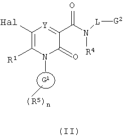 где R1, R4, R5, Y, G1, G2, L и n являются такими, как определено в формуле (I), и Hal представляет собой атом галогена, предпочтительно бромо или йодо, с нуклеофилом R2-М, где R2 является таким, как определено в формуле (I), a M представляет собой группу оловоорганической или борорганической кислоты, и, если желательно или необходимо, превращают полученное в результате соединение формулы (I) или другую его соль в его фармацевтически приемлемую соль.