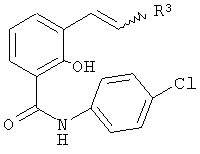 Пример 5.0 Получение амида N-(4-хлорфенил)-3-(4-метоксистирил)салициловой кислоты 904 мг 4-метокси-2′-гидроксистирола предварительно помещают в 40 мл толуола и при 4°C смешивают с 4 мл раствора трихлорида бора (1-молярного в гексане). Затем в течение 1 ч перемешивают при комнатной температуре, смешивают с 614 мг 4-хлорфенилизоцианата и в течение 1,5 ч нагревают до 120°С. После этого примешивают 5 мл метанола и концентрируют. Остаток дважды хроматографируют на силикагеле с использованием в качестве элюента сначала смеси этиловый эфир уксусной кислоты/гексан в соотношении 1:1, а во второй раз – смеси толуол/этиловый эфир уксусной кислоты в соотношении 100:3,5. В результате получают 150 мг (10% от теории) амида N-(4-хлорфенил)-3-(4-метоксистирил)салициловой кислоты в виде масла. Аналогичным путем из соответствующих исходных материалов получают следующие соединения: