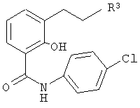 Пример 6.0 Получение амида N-(4-хлорфенил)-3-(4-метоксифенетил)салициловой кислоты 813 мг 4-метокси-2′-гидрокси-1,2-дифенилэтана подвергают обменной реакции аналогично примеру Z-5.0. Полученный после описанной в указанном примере переработки остаток хроматографируют на силикагеле с использованием в качестве элюента смеси этиловый эфир уксусной кислоты/гексан в соотношении 1:1 и соответствующие фракции концентрируют, после чего перемешивают с этиловым эфиром уксусной кислоты/гексаном с образованием при этом кристаллов. В результате получают 375 мг (27,6% от теории) амида N-(4-хлорфенил)-3-(4-метоксифенетил)салициловой кислоты с температурой плавления 141°С. Аналогичным путем получают также следующие соединения: